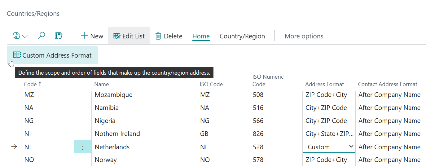 When you choose the Custom address format option, you can further customize the preferred address format. You can do so, by invoking the Custom Address Format action which will open the Custom Address Format page.