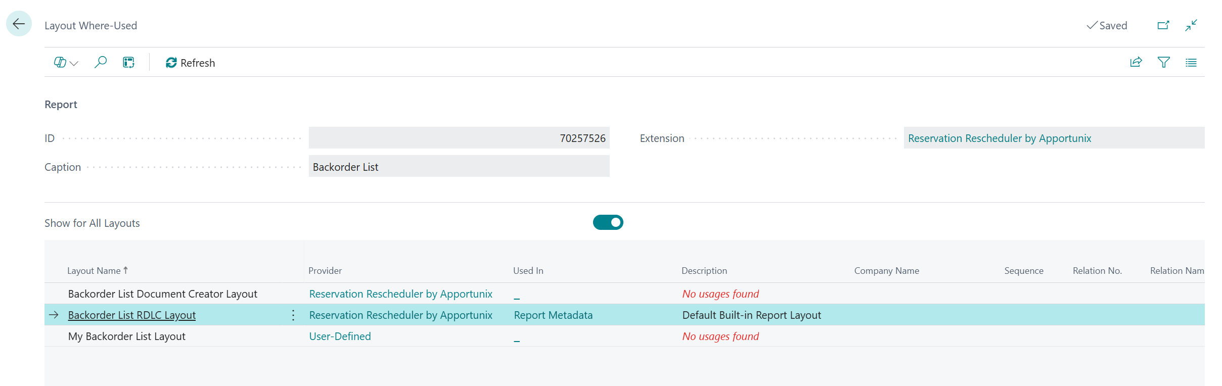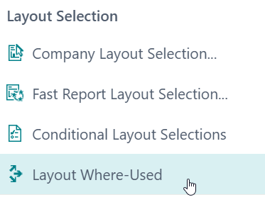 The action opens the Layout Where-Used page will display where the report layout is configured to be used. More specifically, this checks for usages of the report layout in the following locations:
